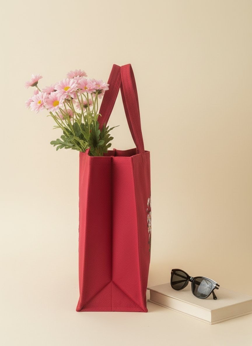 This tote bag is adorned with thread embroidered small daisy flowers motifs. It’s a perfect blend of traditional Indian artistry and modern functionality, making it an ideal accessory for both daily errands and festive outings.