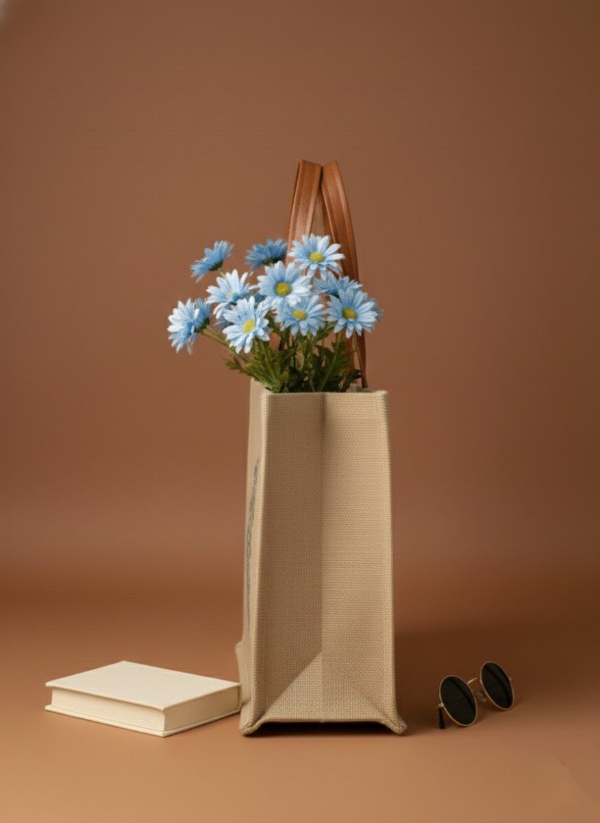 This tote bag is adorned with thread embroidered blue flower motifs. It’s a perfect modern functionality, making it an ideal accessory for both daily errands and festive outings.