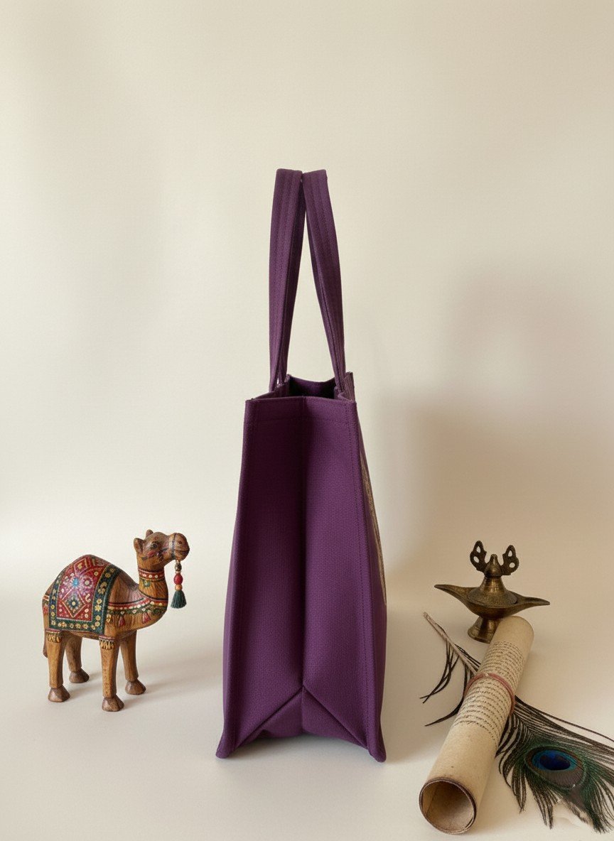 This tote bag is adorned with two intricately embroidered gold paisley motifs. It’s a perfect blend of traditional Indian artistry and modern functionality, making it an ideal accessory for both daily errands and festive outings.